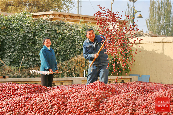 红枣丰收,枣农们正在晾晒、筛选,熟透的枣果在太阳的“烘焙”下散发出甜蜜的味道。(新疆维吾尔自治区若羌县纪委监委供 王勇强 摄)