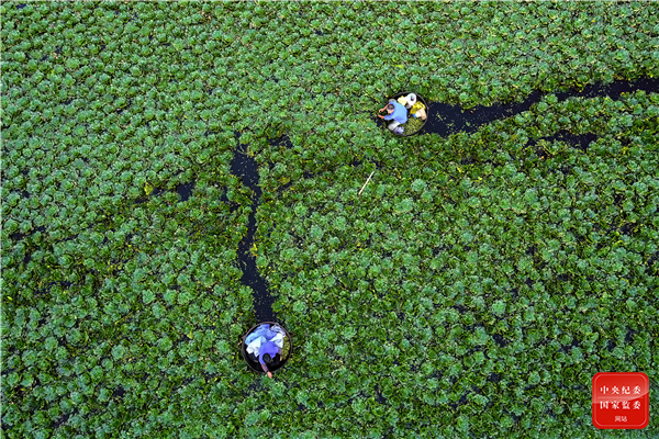 杭州市余杭区仁和街道的水塘里,菱农们正忙着采摘新鲜的菱角,满池翠绿的果实诉说着丰收的喜悦。(杭州市余杭区纪委监委供 陈连孝 摄)