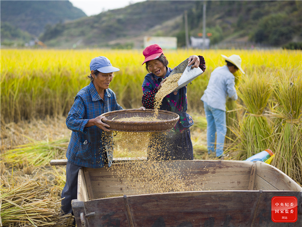 浙江省淳安县的水稻进入收割季,农民洒下饱满的谷粒,喜笑颜开。(浙江省淳安县纪委监委供 洪善富 摄)