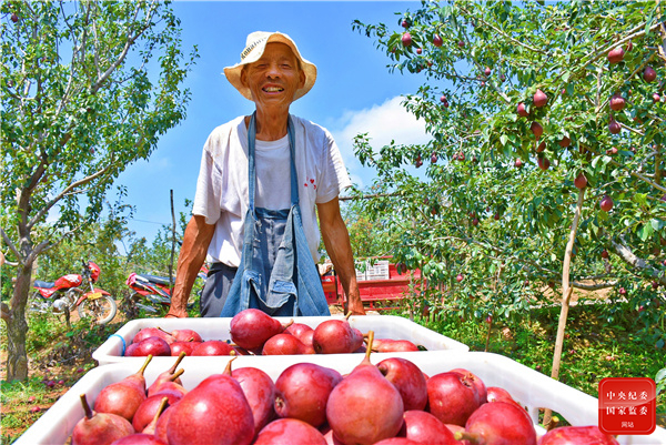 河南省灵宝市城关镇五龙塬上的红梨喜获丰收,果农采摘了新鲜的红梨,赶着到市场上批发销售。(河南省灵宝市纪委监委供 屈艺鸣 摄)