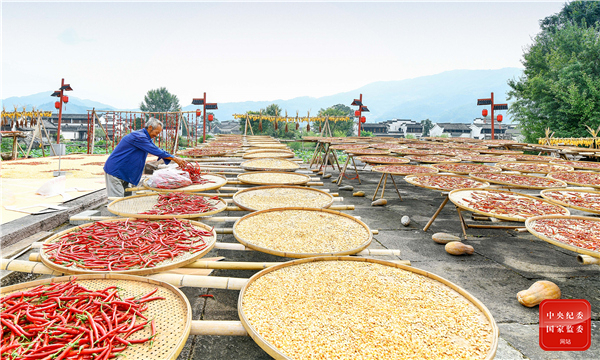 安徽省黟县的农民摊晒收获的玉米和辣椒等农产品,以备冬季和来年食用。(安徽省黟县纪委监委供 崔健 摄)