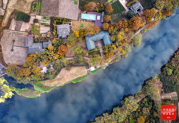 浙江省武义县熟溪湿地依托浮岛、木栈道等景观,滨水种植芦苇、水草、荷花等湿地植物,打造城区滨水旅游休闲区。从空中俯瞰,蓝天白云倒映水中,秋天的湿地就是一幅五彩斑斓的画卷。(浙江省武义县纪委县监委供 徐文荣 摄)