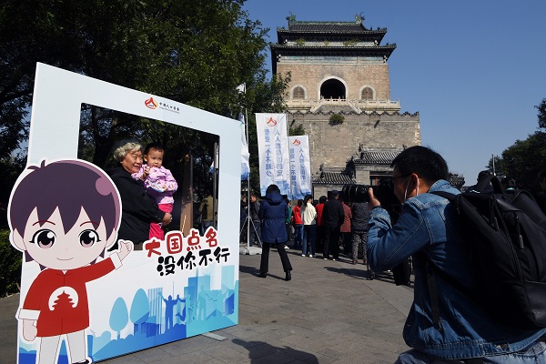 10月15日上午,北京市东城区第七次全国人口普查宣传日活动在钟鼓楼广场举行。图为居民在活动现场参与互动拍照体验。(图片来源:人民视觉)