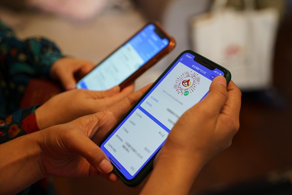 图为广西壮族自治区南宁市兴宁区人口普查员利用手机帮助社区住户完成自主填报户主认证。廖章利 摄