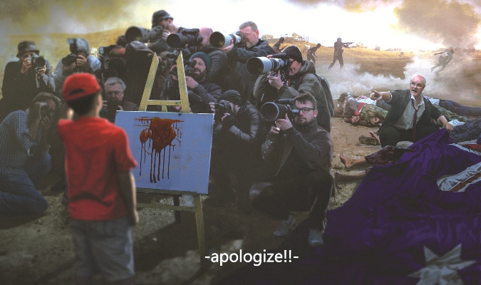 12月1日,中国青年插画师乌合麒麟在社交媒体发布新作品《致莫里森》。画面中,一名酷似莫里森的男子高喊“道歉”,记者的摄像机都对向了瘦弱的画师,但无人在意身后猎杀平民的士兵,以及被国旗掩盖着的死难者。(图片来源:青年插画师@乌合麒麟)