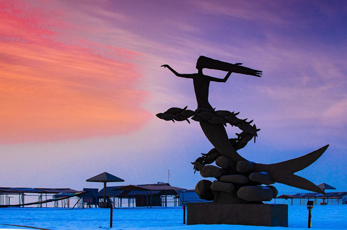 一场雪纷纷扬扬翩然而至,暖黄的夕阳下,群鸟自在地飞翔,冬日的博湖静谧且浪漫。(刘浩 摄)