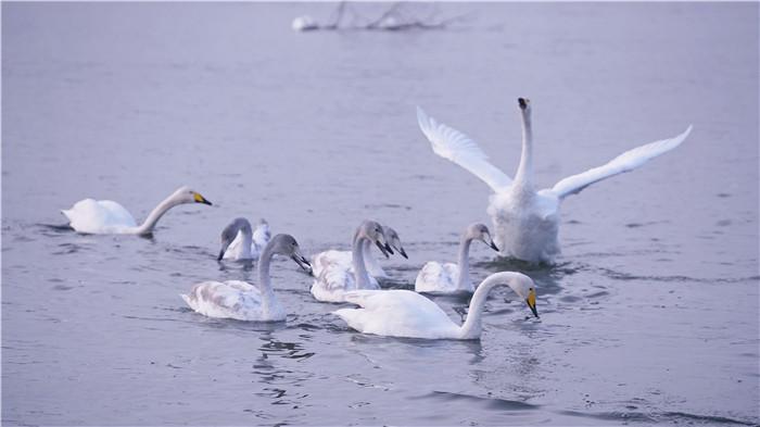 冬日的孔雀河,天鹅在河中悠闲自在地游弋,为寂静的河面增添了一道移动的风景线。(姚谦 摄)