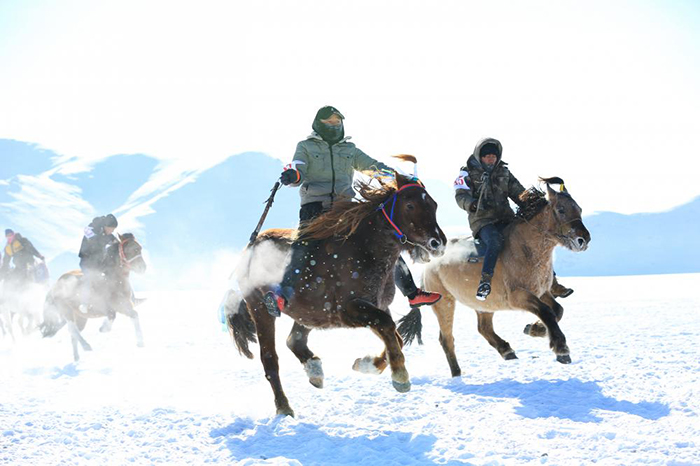 每年冰雪节已经成为和静县巴音布鲁克草原当地的特殊习俗,在这天,牧民们精心挑选最好的马匹在雪原上开展赛马活动。(王福生 摄)