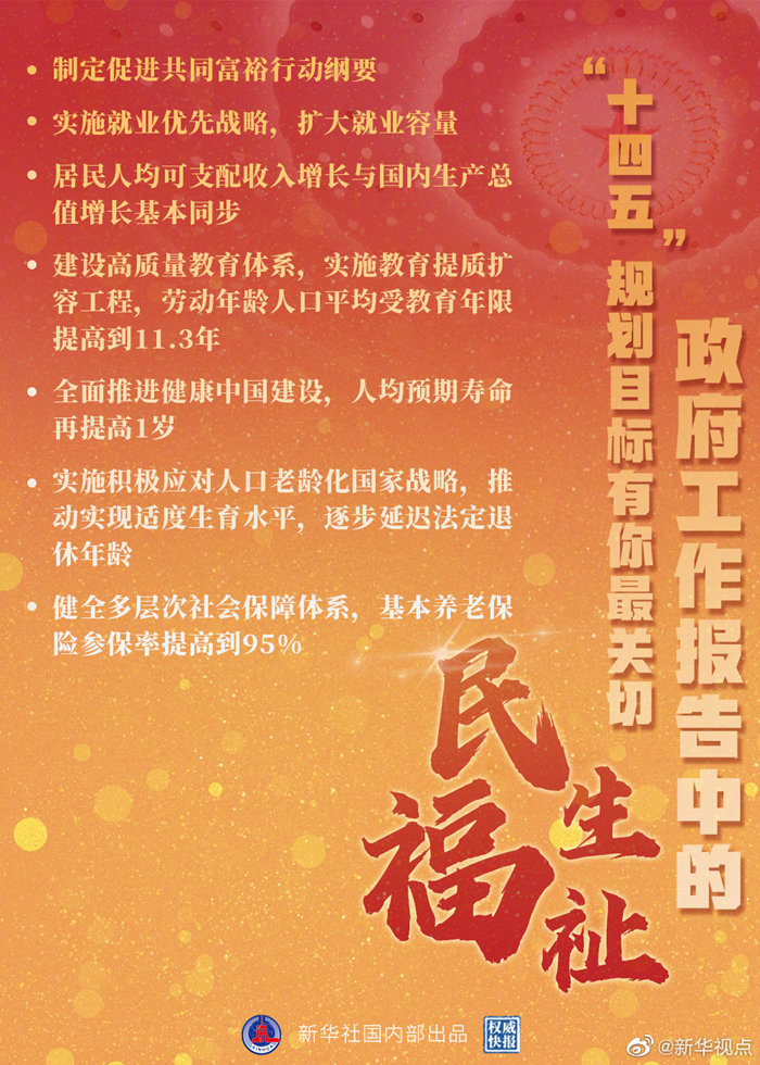 ——持续增进民生福祉,扎实推动共同富裕。坚持尽力而为、量力而行,加强普惠性、基础性、兜底性民生建设,制定促进共同富裕行动纲要,让发展成果更多更公平惠及全体人民。实施就业优先战略,扩大就业容量。着力提高低收入群体收入,扩大中等收入群体,居民人均可支配收入增长与国内生产总值增长基本同步。建设高质量教育体系,深化教育改革,实施教育提质扩容工程,劳动年龄人口平均受教育年限提高到11.3年。全面推进健康中国建设,构建强大公共卫生体系,广泛开展全民健身运动,人均预期寿命再提高1岁。实施积极应对人口老龄化国家战略,以“一老一小”为重点完善人口服务体系,推动实现适度生育水平,逐步延迟法定退休年龄。健全多层次社会保障体系,基本养老保险参保率提高到95%,优化社会救助和慈善制度。发展社会主义先进文化,提高社会文明程度,提升公共文化服务水平,健全现代文化产业体系。