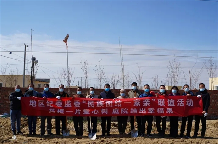 在民族团结教育月期间,阿勒泰地区纪委监委组织机关干部来到福海县喀拉玛盖镇吉迭勒村,开展“共植一片爱心树,庭院结出幸福果”活动,在结亲户庭院栽种果树,美化绿化环境,拓宽增收渠道。(阿勒泰地区纪委监委 李春红 李鹏 摄)