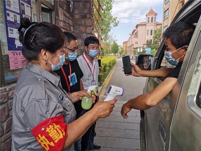 伊犁州新源县纪委监委深入乡镇、村(社区)、学校、商超、餐饮文化市场、医疗机构,通过暗访、实地查看等多种形式,督促各级各部门严格履行疫情防控主体责任,监督检查组在新源县香悦曦城小区门口检查开展“一码四查”情况。(陈思熠 摄)