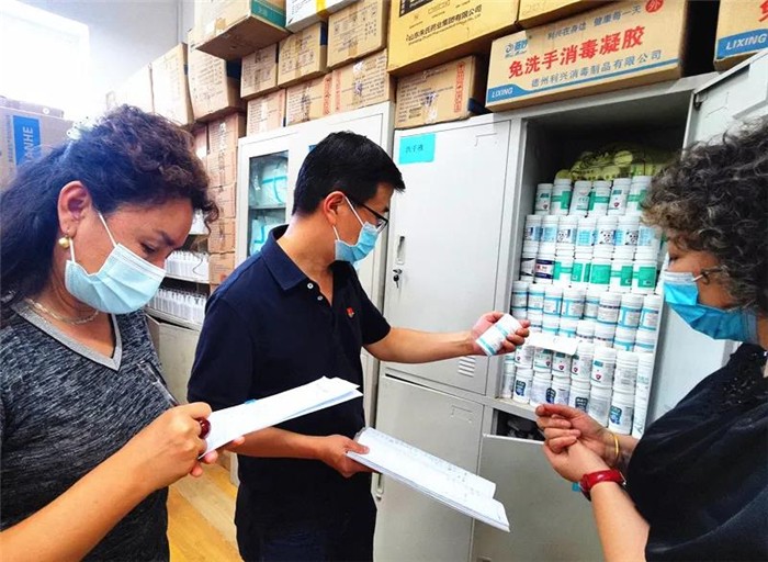 乌鲁木齐市高新区(新市区)纪委监委第三协作区在辖区学校现场查看防疫物资储备情况。(黄玮玲 摄)