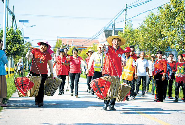 9月21日,江苏省南通市海安市角斜镇新坝村农民在参加挑箩筐比赛,庆祝丰收节。(图片来源:视觉中国)