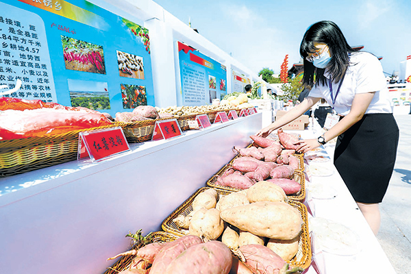 9月22日,河北省石家庄市举办活动庆祝丰收,在赞皇县西阳泽乡德裕古镇,工作人员正在整理特色农产品。(图片来源:视觉中国)