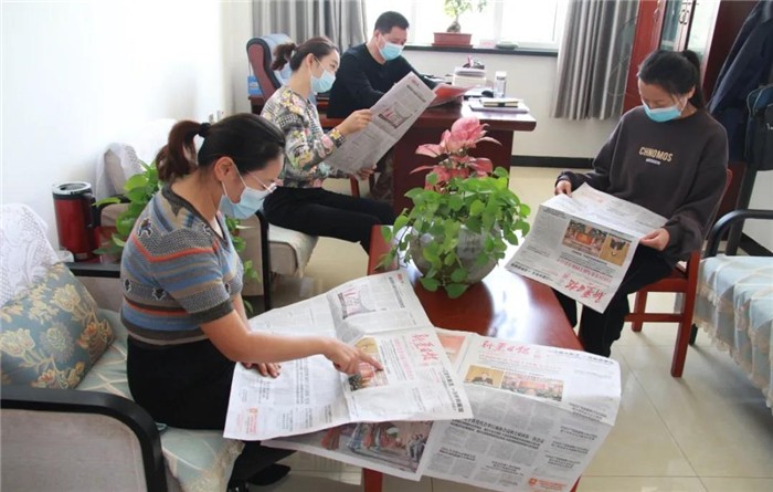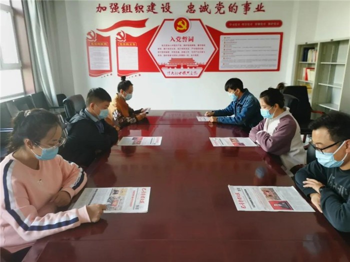 奇台县纪委监委各部室党员干部认真研读自治区第十次党代会新闻报道,交流学习心得。(李佳 摄)