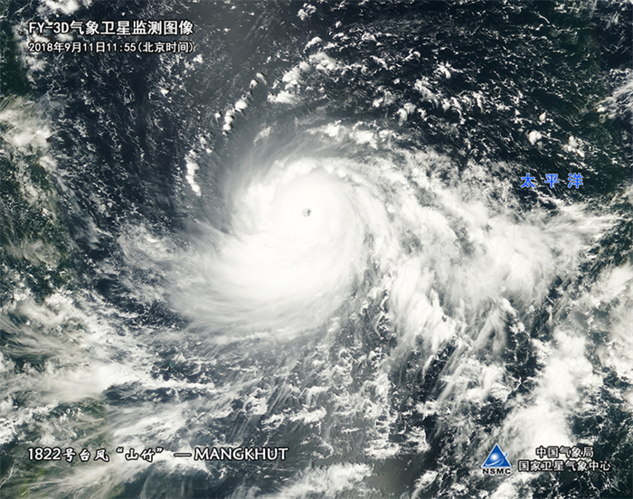 2018年9月11日,“山竹”出现清晰的台风眼,南侧和东侧云系发展旺盛。图源:中国气象报社