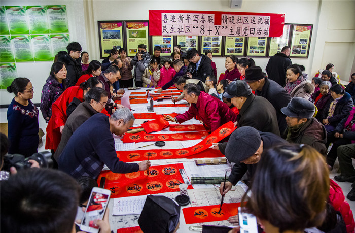 腊月二十三以后,家家户户都要写春联。传统民间讲究有神必贴,每门必贴,每物必贴,所以春节的对联数量最多,内容最全。挥毫泼墨,一副副喜庆的春联、一份份美好的祝福送到社区居民手中。