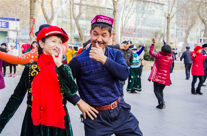 春节快要到了,库尔勒市的各族群众在广场上跳起新疆民族舞“麦西来甫”,通过以舞绘就“民族团结一家亲”,庆祝春节的即将到来。