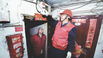 张黎明(右)在天津滨海新区一处老旧居民小区义务安装节能灯。资料照片