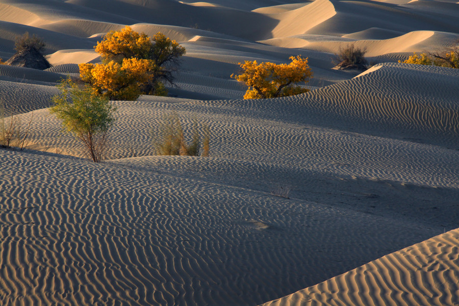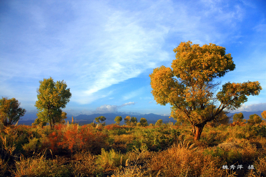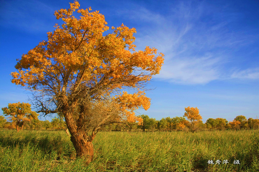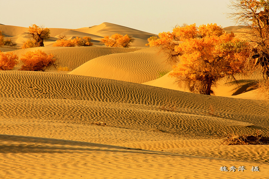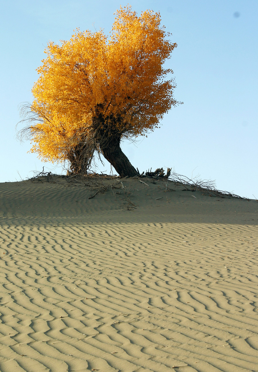 金秋十月,是胡杨最美的季节,荒野上的胡杨林穿上它一年中最灿烂的盛装,金黄色的树叶在阳光的照耀下,更是层林尽染,美轮美奂,将单调的沙漠装点的像童话世界般美丽。