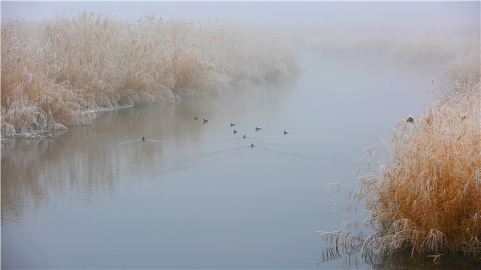 群鸭戏水隐蒹葭,孤雁凌波看落霞。