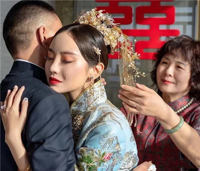 女儿出嫁,是每一位母亲人生中的头等大事,即使心中万般不舍,仍轻轻地帮女儿整理头饰,祝福女儿今后的生活幸福美满。