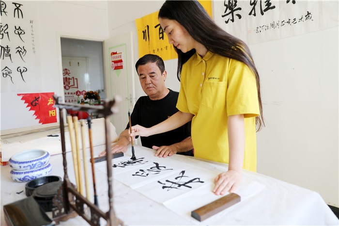 库尔勒市广泛发动党员干部群众参与廉政文化宣传周活动,将廉政文化根植于百姓内心。图为库尔勒市团结街道阳光社区居民阿布拉江•吾买尔和女儿古丽尼尕•阿布拉书写清廉之风。(魏银和 摄)