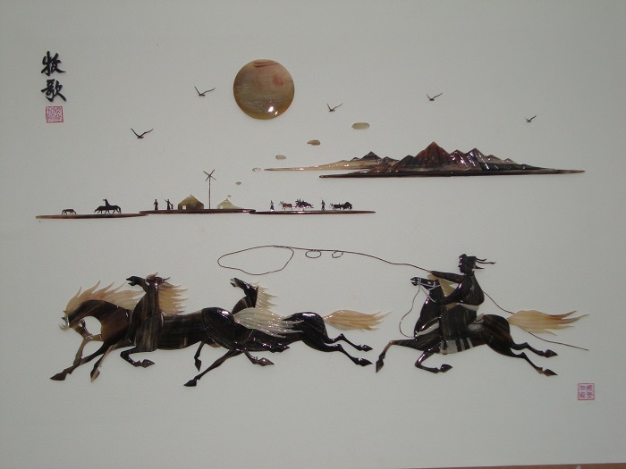 骨雕作品《牧歌》,作者利用娴熟的雕刻技艺将牧民们衣食无忧、自由自在的幸福生活表现的淋漓尽致。