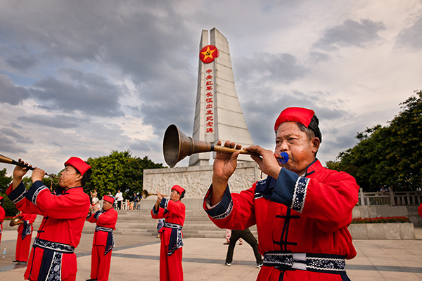 一曲曲唢呐印证着世事冷暖,一声声吹打承载着人间悲欢。在江西省于都县,国家级非物质文化遗产唢呐公婆吹犹如山花绽放在村村寨寨。80多年前,于都人民用荡气回肠的唢呐声,挥泪送别红军;如今,于都人民吹响唢呐,庆贺脱贫摘帽。(江西省于都县纪委监委供 王庆华 摄)