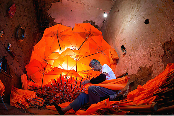 安徽省宣城市泾县油布伞制作工艺是几代人情怀的文化印记,是中国民间伞艺的活化石。一把泾县孤峰油布伞,要经70多道工序才能完工。图为工匠在整理伞布,墙壁上斑驳陆离的痕迹见证着岁月沧桑。(安徽省宣城市泾县纪委监委供 张濛 摄)