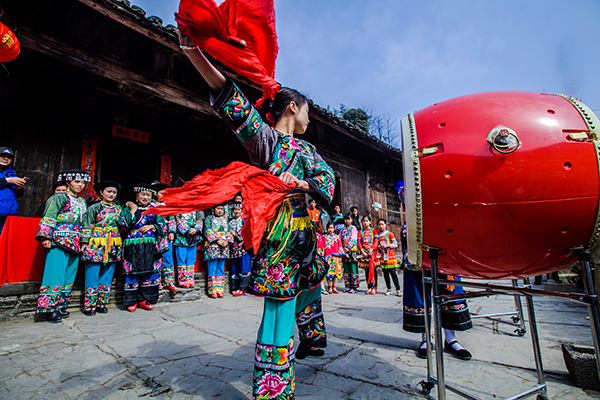 苗族鼓舞历史悠久,在湘西苗区代代相传,2016年入选国家首批非物质文化遗产名录。苗族鼓舞有花鼓舞、猴儿鼓舞、八合鼓舞、团圆鼓舞等多种形式,是苗族人民最喜爱、最普及的舞蹈艺术形式。图为苗鼓老师正在传授打苗鼓技艺。(湖南省张家界市永定区纪委监委供 刘波 摄)(中央纪委国家监委网站 王小宁 整理)