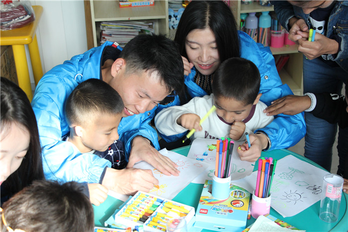 巴州焉耆县返乡大学生在县幼儿园听力言语康复中心的教室开展“情暖聋哑儿童爱心慰问活动”,一起动手绘出一幅幅充满童趣的画,为他们的健康成长提供更多的关爱和正能量。(莫日根 摄)