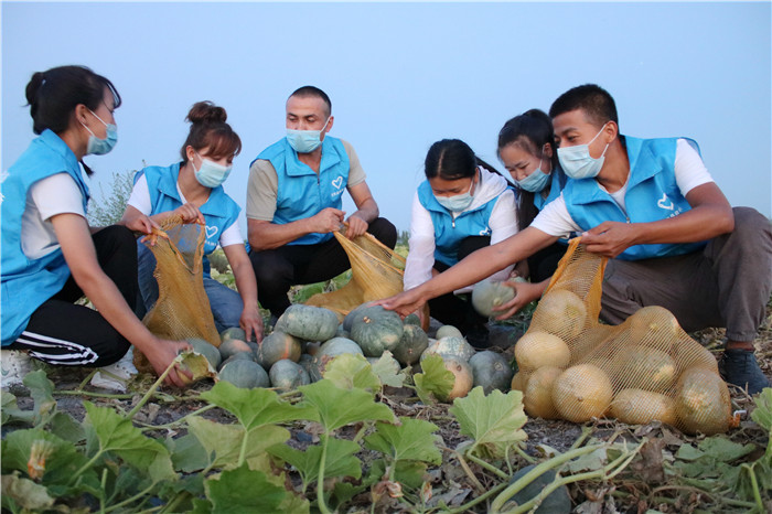 巴州焉耆县返乡大学生自发成立志愿者服务团队,帮助农民采摘果蔬,缓解劳动力不足的压力,还充分结合自身优势,开展政策宣传、爱心助贫帮困等各类志愿服务,用他们的爱心传递正能量,用实际行动践行社会主义核心价值观。(马晶 摄)